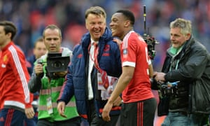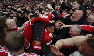 Anthony Martial of Manchester United, centre, is mobbed by fans and team-mates after scoring the winning goal. Photograph: Adrian Dennis/AFP/Getty Images
