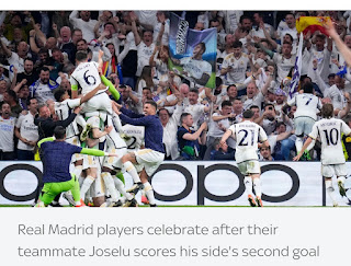 Real Madrid produced a stunning Champions League comeback to sink Bayern Munich 2-1 and 4-3 on aggregate; Alphonso Davies gave Bayern a lead that they held until 88 minutes, then former Stoke striker Joselu struck twice in three minutes; Real will meet Borussia Dortmund on June 1.
